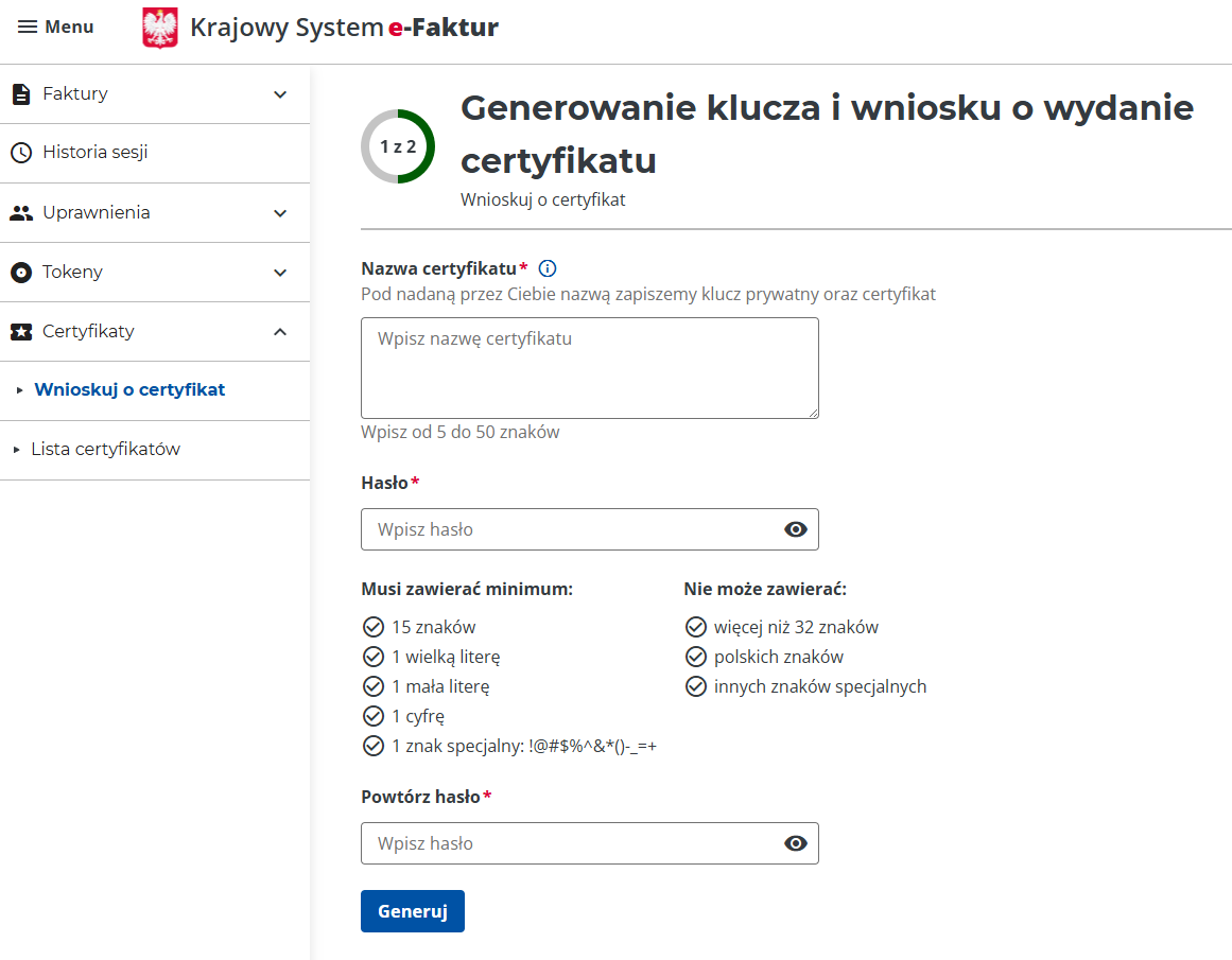 Należy wprowadzić Nazwę certyfikatu oraz Hasło (będzie potrzebę do wprowadzenia w programie). Po wygenerowaniu zostanie pobrany plik z kluczem prywatnym .key.