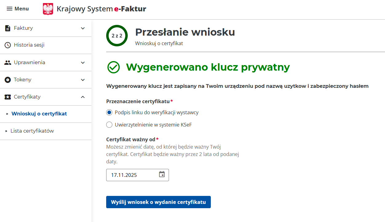 Po wypełnieniu formularza kliknij przycisk Wyślij wniosek o wydanie certyfikatu aby wygenerować certyfikat.