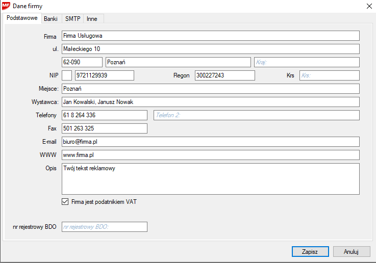Pierwsza zakładka Podstawowe przeznaczona jest do wprowadzenia danych firmy. Dane te będą widoczne na wystawianych dokumentach. Należy zwrócić uwagę na dwie pozycje. Pierwsza NIP składa się z dwóch pól. W pierwszy możemy wpisać symbol np: PL, jest on widoczny na fakturach wewnątrzwspólnotowych. W drugie pole wpisujemy numer NIP-u. Pole Użytkownik pozwala na wprowadzenie danych kliku osób (przykład: Jan Kowalski, Artur Nowak, Piotr Malinowski). Umożliwi to wybranie osoby, która wystawia fakturę.