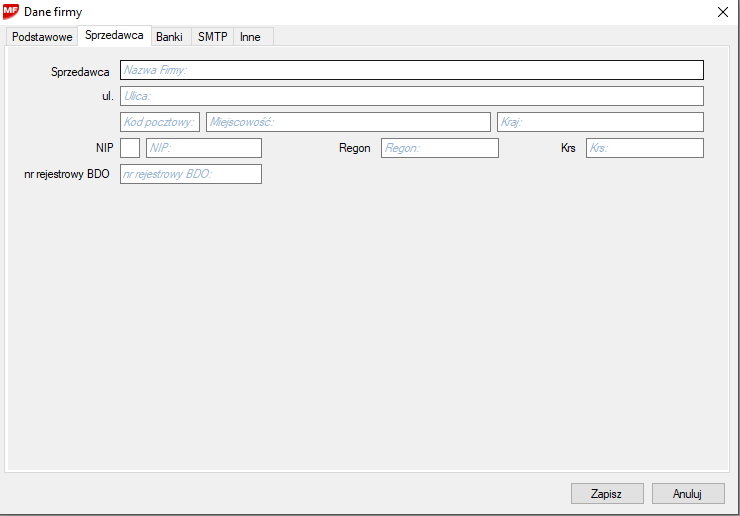 Podczas pierwszego uruchomienia wyświetla się okno do wprowadzania danych firmy.