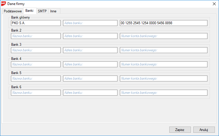 Banki. Zakładka pozwala na wprowadzenie danych sześciu różnych kont bankowych.