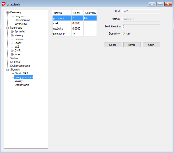 Możemy również zaznaczyć, która forma płatności jest domyślną i taka będzie ustawiona automatycznie przy tworzonych nowych dokumentach.