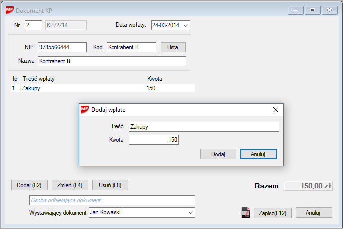Przygotowanie nowego dokumentu odbywa się za pomocą przycisku Dodaj(F2). Wywoływane jest okno wyboru kontrahenta. Wybieramy właściwego i przechodzimy do edycji wpłat.