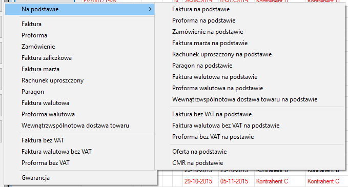 Na podstawie > – wyświetla się menu pozwalające na utworzenie innych nowych dokumentów na podstawie już istniejących