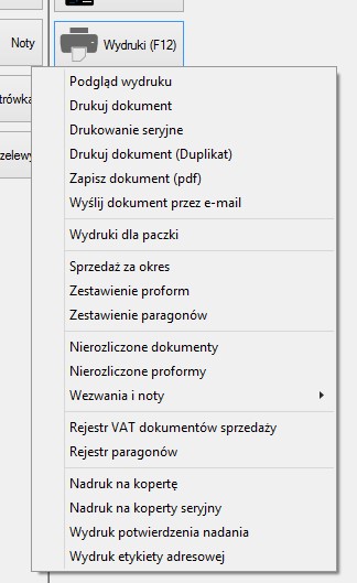 Wydruk (F12) - Po użyciu tego przycisku rozwija menu kontekstowe z listą możliwych wydruków: