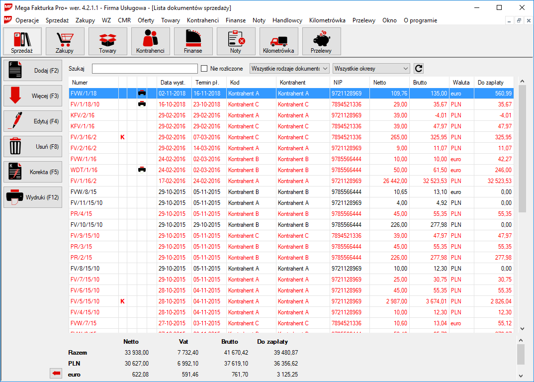 Na liście dokumentów można włączyć kolorowanie przeterminowanych dokumentów. Kolor czerwony oznacza przeterminowaną fakturę, kolor niebieski dzisiaj jest termin płatności, kolor pomarańczowy termin płatności mija za trzy dni, kolor czarny dokument opłacony lub jeszcze nie miną termin płatności