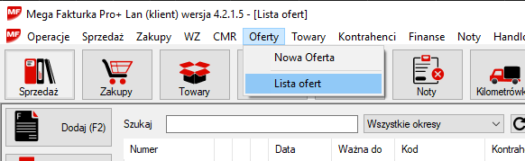 Po wybraniu z menu systemowego Oferty , następnie Lista ofert zostanie wyświetlona lista ofert.