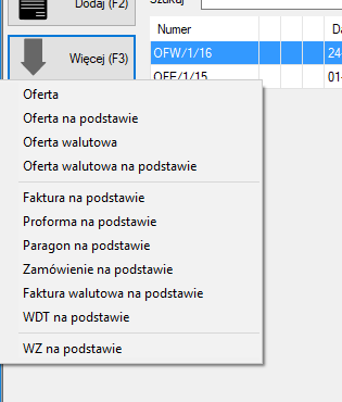 Faktura na podstawie- po wybraniu oferty z listy, następuje otwarcie nowego dokumentu faktura z przepisanie danych Klienta, pozycji towarowych wraz z cenami, formy płatności.
