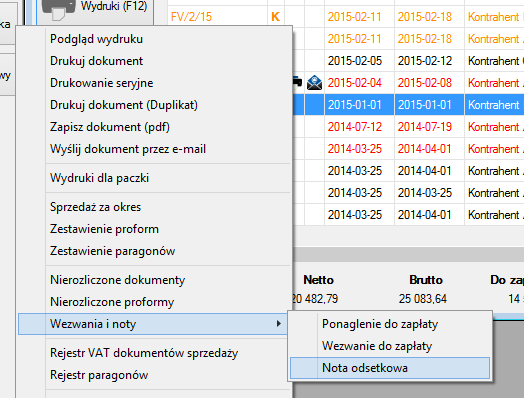 Aby wygenerować notę odsetkową należy na liście dokumentów zaznaczyć opłacony w całości dokument i kliknąć na przycisk Wydruki a następnie wybrać Wezwanie i noty -> Nota odsetkowa.