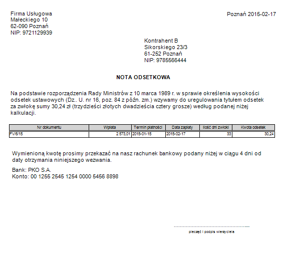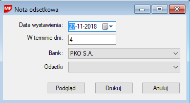 Następnie wybieramy datę wystawienia dokumentu i określamy ilość dni terminu do zapłaty odsetki oraz na jaki rachunek należy wpłacić zaległości oraz metodę obliczania odsetek.