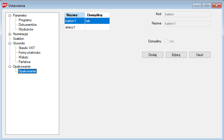 Okno edycji pozwala na dodawanie, usuwanie i edytowanie Opakowań dla dokumentów CMR. Składa się ono z podglądu po lewej oraz pól edycji po prawej. Jeśli istnieje potrzeba dodania nowego opakowania naciskamy przycisk Dodaj. Pola po prawej staną się aktywna i możliwe stanie się wprowadzenie nowego opakowania. W celu poprawienia opakowania zaznaczamy je na liście a następnie naciskamy Edytuj. Po wprowadzeniu zmian należy zawsze zapisać zmiany.