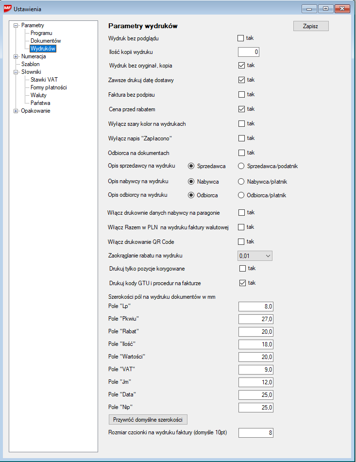 Szerokości pól na wydrukach dokumentów. Z pomocą pól z tej zakładki ustalamy szerokości tabel zawierające informacje o sprzedaży towarów.