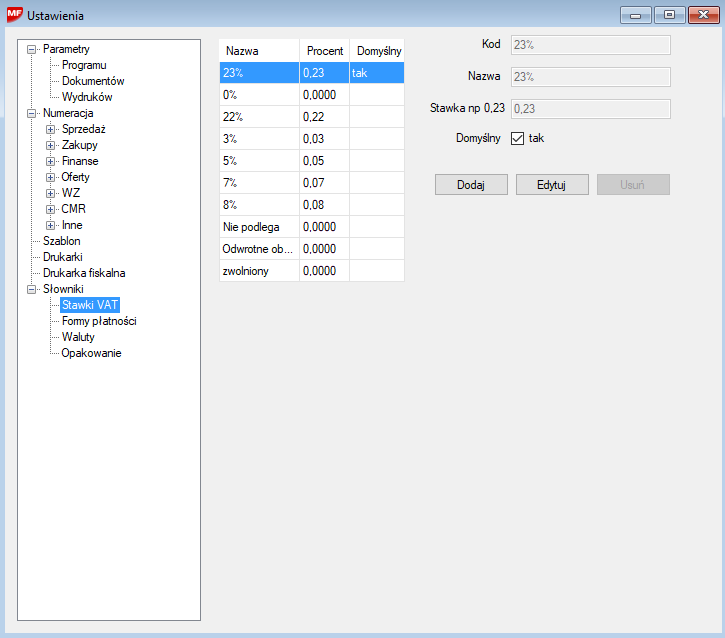 Okno edycji pozwala na dodawanie, usuwanie i edytowanie stawek VAT. Składa się ono z podglądu po lewej oraz pól edycji po prawej. Jeśli istnieje potrzeba dodania nowej stawki VAT naciskamy przycisk Dodaj. Pola po prawej staną się aktywna i możliwe stanie się wprowadzenie nowej stawki. W celu poprawienia stawki zaznaczamy ją na liście a następnie naciskamy Edytuj. Po wprowadzeniu zmian należy zawsze zapisać zmiany.