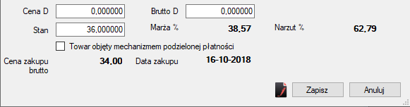 Podczas edycji dla towaru mamy informacje o marży i narzutu oraz ostatniej ceny i daty zakupu