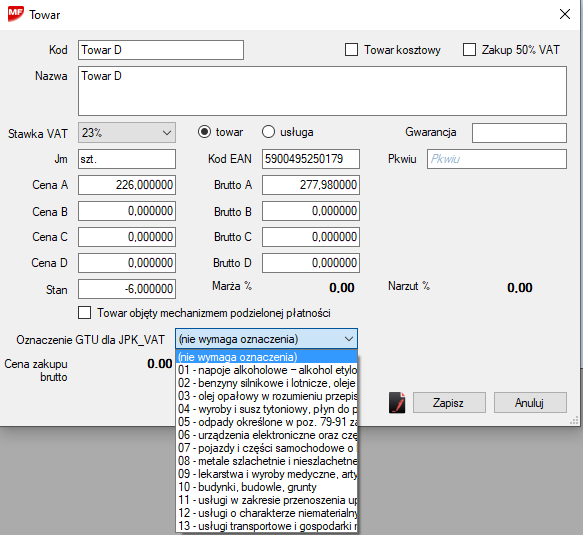 Oznaczenie GTU dla JPK_VAT należy wybrać do towaru lub usługi jeżeli jest to wymagane. Oznaczenie to zostanie przepisane do faktury w momencie dodania tego towaru lub usługi do faktury. (od wersji Pro)