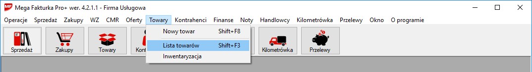 Po wybraniu z menu systemowego Towary -> Lista towarów Shift+F3 zostanie wyświetlona lista towarów. Ten sam efekt otrzymujemy wybierając Towary z szybkiej nawigacji.