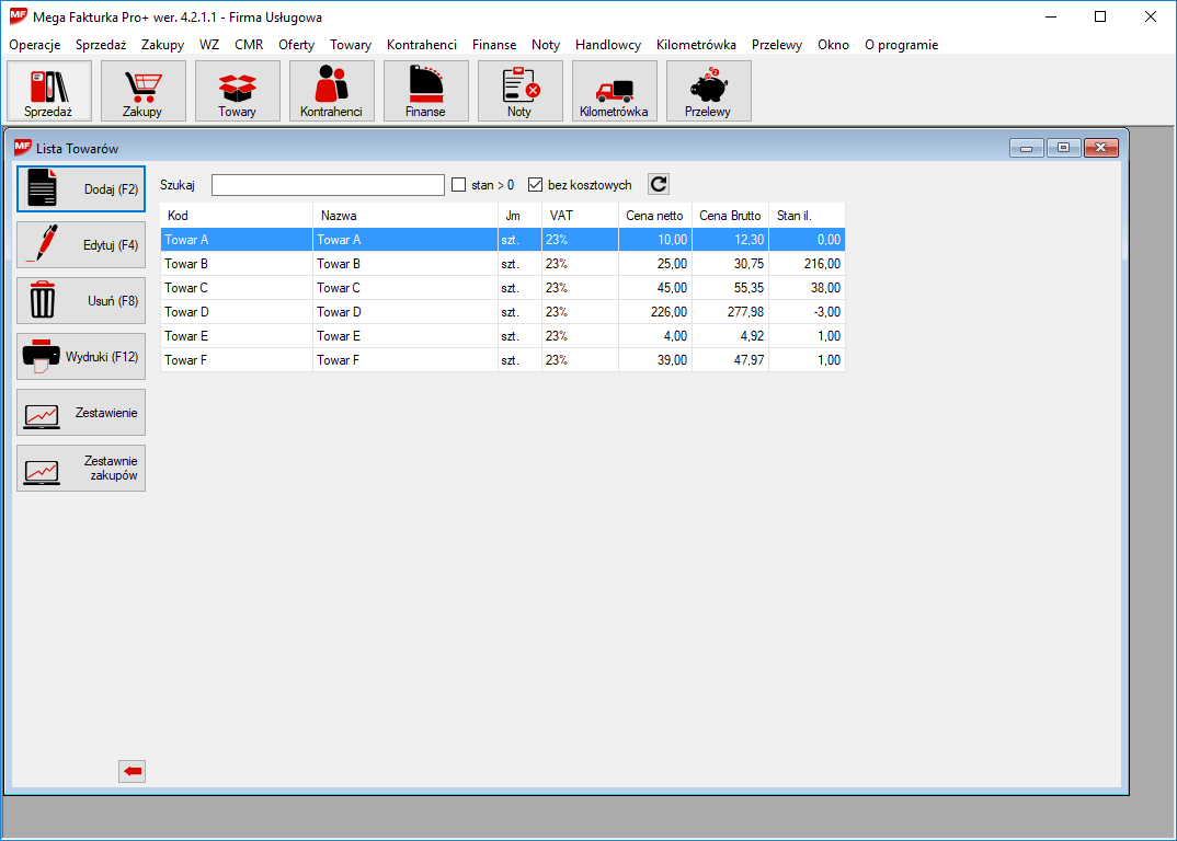 Aby zapisać nowy towar wymagane jest wypełnienie trzech podstawowych pozycji: Kod, który może być dowolny wedle uznania. Jeżeli nie podamy treść zostanie ona przepisana z pola Nazwa, – czyli nazwa towaru. Można podać cztery ceny i wykorzystać różne cenniki w trakcie wystawiania faktur. Jeżeli w parametrach programu została zaznaczona opcja "Sprzedaż w cenach – brutto" będzie możliwe podanie kwoty brutto dla towaru. Wprowadzając ceny netto automatycznie zostanie przeliczone i wyświetlona kwota brutto, analogicznie przy wprowadzaniu kwoty brutto.