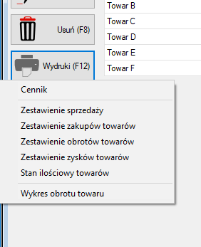 Wydruk(F12) -Po użyciu tego przycisku rozwija menu kontekstowe z listą możliwych wydruków: