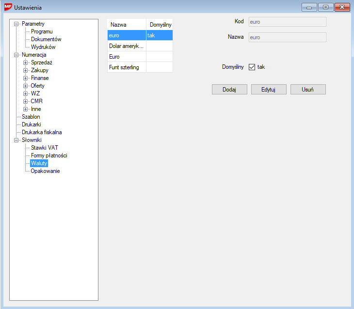 Okno edycji pozwala na dodawanie, usuwanie i edytowanie walut. Składa się ono z podglądu po lewej oraz pól edycji po prawej. Jeśli istnieje potrzeba dodania nowej waluty naciskamy przycisk Dodaj. Pola po prawej staną się aktywna i możliwe stanie się wprowadzenie nowej waluty. W celu poprawienia waluty zaznaczamy ją na liście a następnie naciskamy Edytuj. Po wprowadzeniu zmian należy zawsze zapisać zmiany.