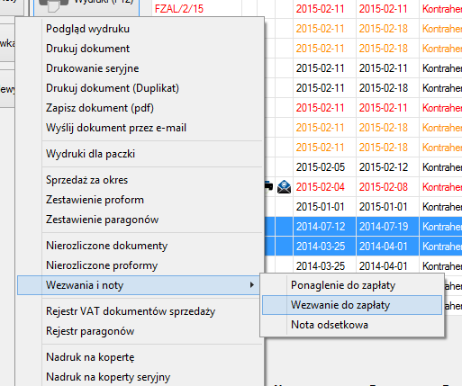 Aby wygenerować wezwanie do zapłaty należy na liście dokumentów zaznaczyć niezapłacone dokumenty jednego kontrahenta i kliknąć na przycisk Wydruki a następnie wybrać Wezwanie i noty -> Wezwanie do zapłaty.