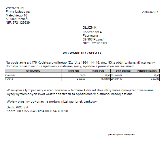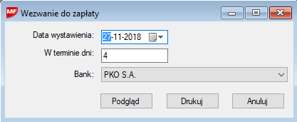 Następnie wybieramy datę wystawienia dokumentu i określamy ilość dni terminu do zapłaty zaległości oraz na jaki rachunek należy wpłacić zaległości.