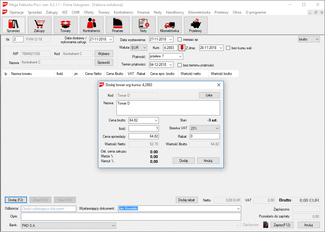 Po wprowadzeniu kursu każdy towar dodawany do dokumentu będzie automatycznie przeliczany wg kursu i dodawany już w walucie.