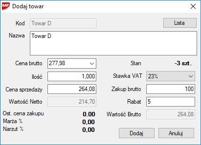 Podczas dodawania pozycji na fakturę możemy wprowadzić cenę zakupu brutto sprzedawanej pozycji. Będzie ona jedynie służyła do poprawnego wydruku rejestru sprzedaży VAT.