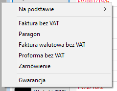 Wystawianie dokumentu faktura bez VAT dla firm zwolnionych ustawowo z VAT wykonuje się na liście dokumentów klikając na przycisk Więcej (F3) i z rozwijanego menu wybieramy Faktura bez VAT.