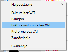 Wystawianie dokumentu faktura walutowa bez VAT dla firm zwolnionych ustawowo z VAT wykonuje się na liście dokumentów klikając na przycisk Więcej (F3) i z rozwijanego menu wybieramy Faktura walutowa bez VAT.