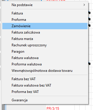 Wystawianie dokumentu Zamówienie wykonuje się na liście dokumentów klikając na przycisk Więcej (F3) i z rozwijanego menu wybieramy Zamówienie.