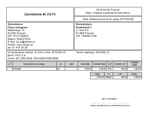 Przykład wydruku zamówienia.