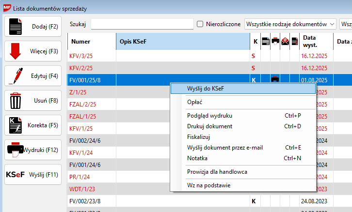 - Kliknij przycisk „KSeF” lub użyj prawego przycisku myszy i wybierz opcję „Wyślij do KSeF” z menu kontekstowego.