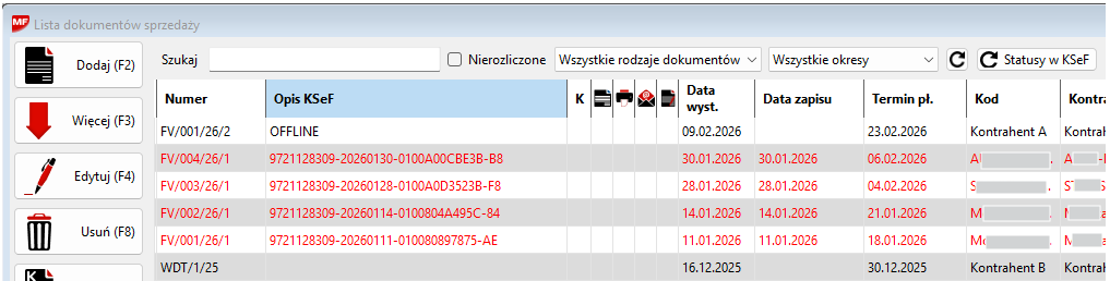 - „OFFLINE” - Dokument został wystawiony w trybie offline, z powodu braku internetu lub braku odpowiedzi KSeF, dokument musi być ponownie wysłnay w 24 godziny, zostanie również automatycznie wysłany do KSeF podczas sprawdzania statusów , oraz przy uruchomieniu programu.